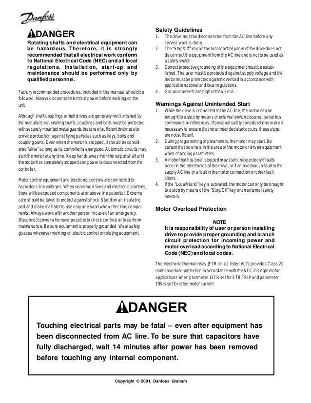 Mg14i102 vlt is a registered danfoss trademark 1. 345 terminal tightening torques 26 346 input line connection 26 347 motor wiring 26 348 grounding earthing 27 349 control wiring 27 3410 serial communication bus connection 28 3411 programming 28 4 start up 29 411 inspection before start up 30. When reading through this operating instructions you will come across various symbols that require special. When the drive is the first last or only device on a network switches 2 and 3 must be on. Vlt is a registered danfoss trademark5 general the specific installation instructions may vary depending upon the model of vlt 6000 series being installed. Vlt 6000 network wiring table ii.