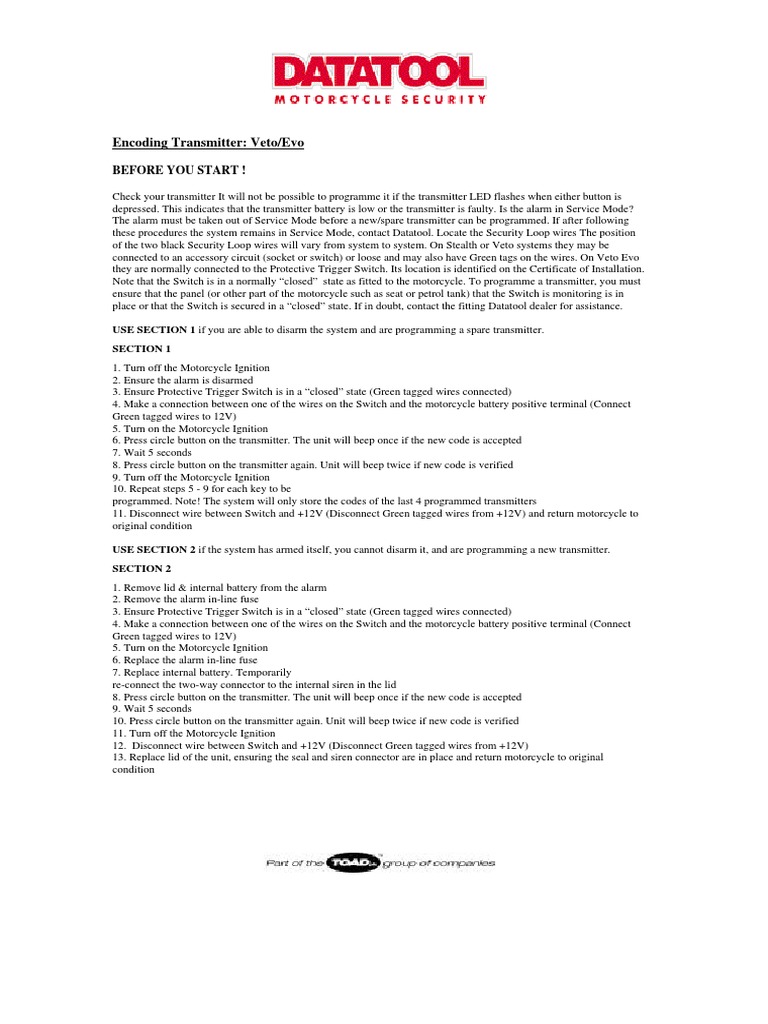 Bought two new batteries but a pain to turn off and the indicators would not flash. Check that you are within range of the motorcycle 10m max. Check the ignition switch is in the off position. Datatool veto evo user guide page 7 check the alarm system fuse. Datatool veto evo plus keyfob ducati 916 alarm. Veto evo transmitter coding pdf.