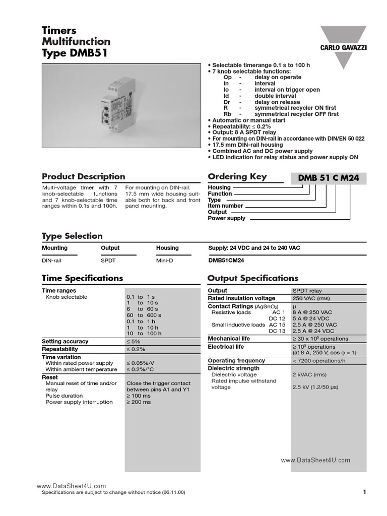 Din 175 mm wide suitable both for back and front panel mounting multi voltage range. If the trigger contact is closed before the end of. Carlo gavazzi multi function timer dmb51cm24 housing. 05 nm according to iec en 60947 approval ul csa. The dmb51cm24 is a multifunction timer with 7 knob selectable functions and 7 knob selectable time ranges within 01s and 100h. Wiring diagram operation diagrams function aa asymmetrical recycler on first power supply relay on led function ab asymmetrical recycler off first dcb51 general specifications housing dimensions 175 x 81 x 672 mm material pa66 weight approx 100 g screw terminals tightening torque max.