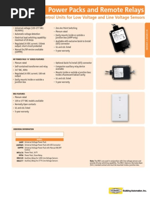 The universal voltage power pack is a self contained transformer and relay an onoff switch controlled by a circuit designed for low voltage 24 vdc occupancy sensors. An auxiliary pack is capable of switching a 15a mpsa or 20a mpshd loads and feature zero arc point switching minimizing relay contact wear from inrush loads.