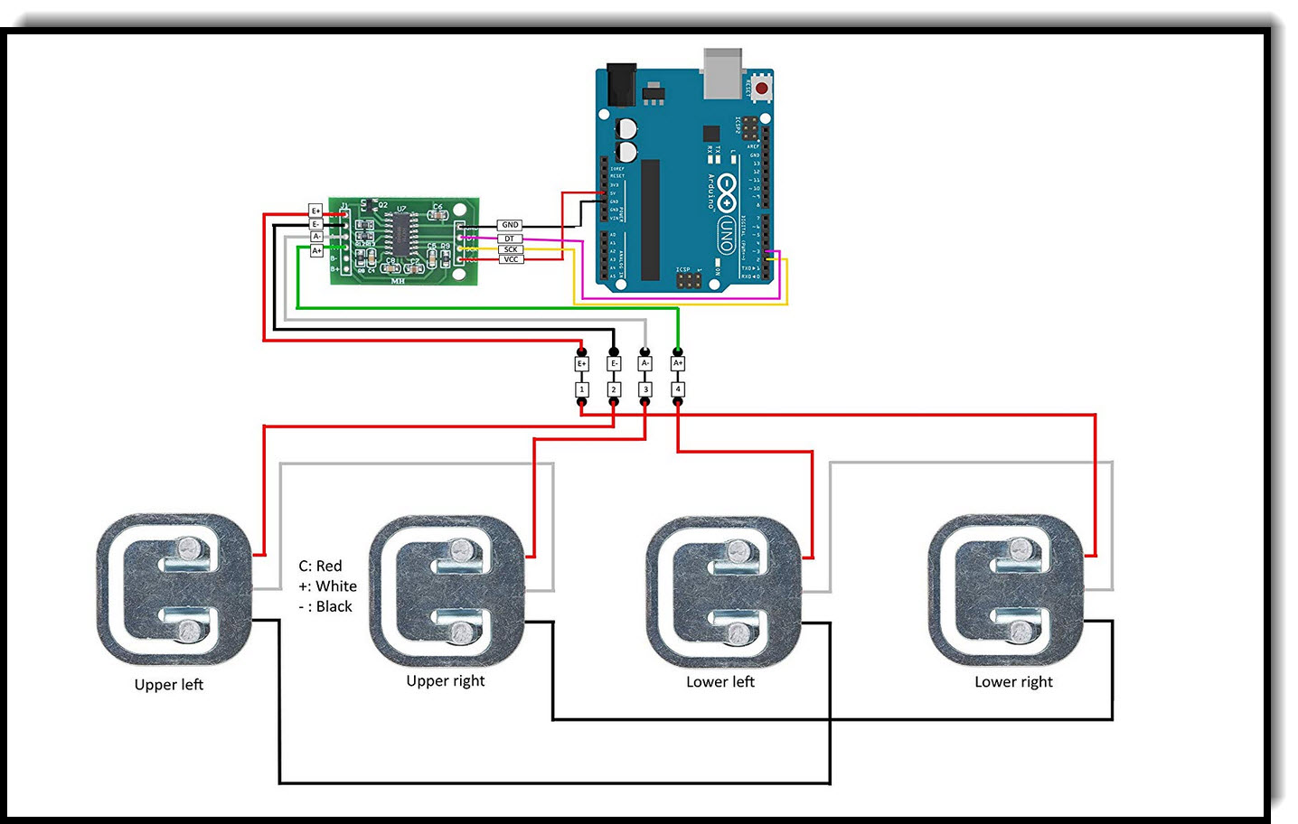 The hx711 uses a two wire interface clock and data for communication. Connect the dt and sck of the hx711 module to any of the arduino digital io pins. See the wiring diagram for how to connect the load cells hx711 and arduino. A load cell or strain gauge has 4 wires the red wire of the load cell is connected with the e black wire is connected with the e the white wire is connected with the a and green wire of the load cell or strain gauge is connected with the a of the hx711 board.