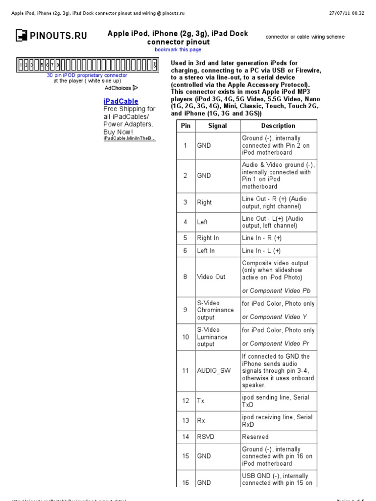 Apple Ipod Iphone 2g 3g Ipad Dock Connector Pinout