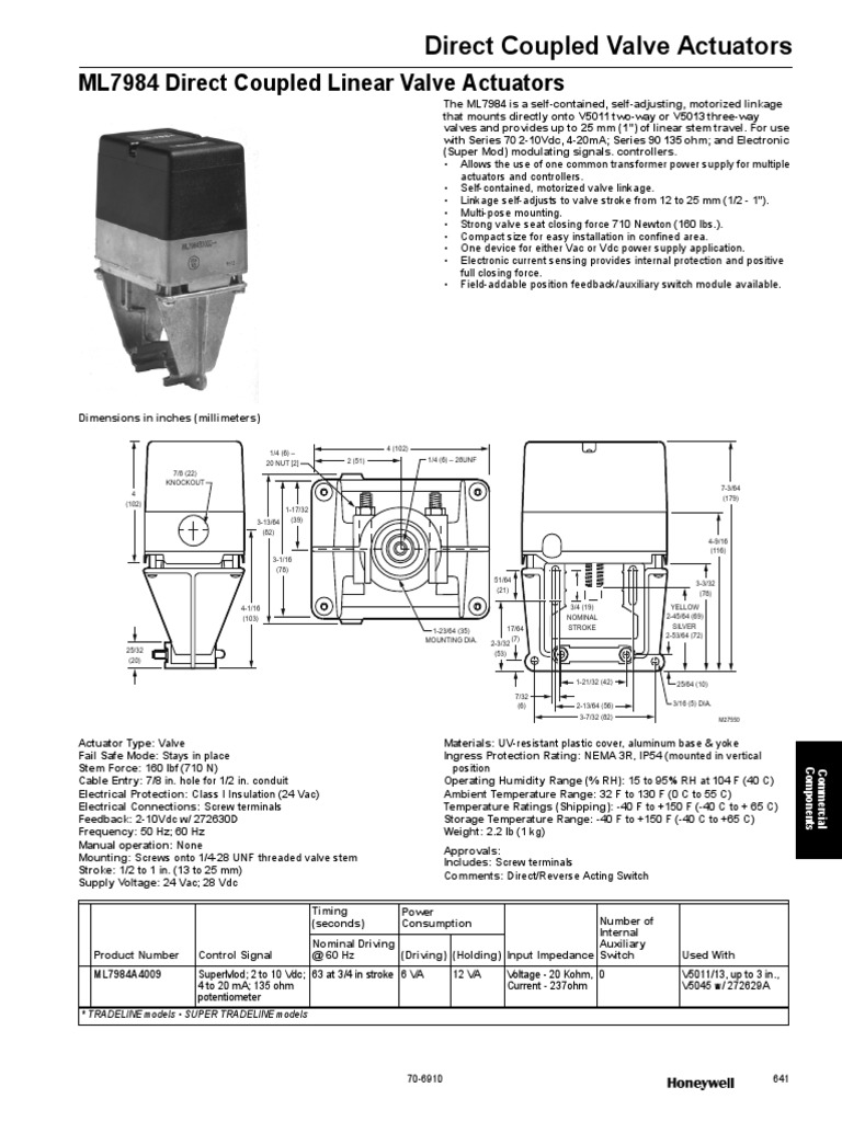 25 ma 24 vac 5 wire mode only 500 ma valve seating 3 wire mode minimum signal input duration. The ml7984 is a self contained self adjusting motorized linkage that mounts directly onto v5011 two way or v5013 three way valves and provides up to 25 mm 1 inch of linear stem travel. Input impedance for the ml7984. Voltage source 20 kw ohm current source 237 ohm shipping weight. Do not mix m9846 or modutrol motors with the ml7984 in the same circuitry. 4 20 madc may be used with 0 10 vdc input but valve will be closed at 2 vdc.