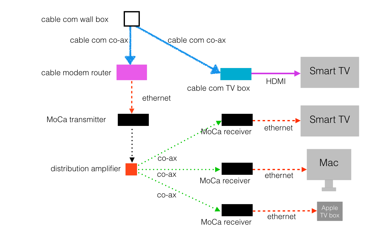 Moca wiring diagram. Consequently moca network transmissions between moca device 1 and the other moca devices must traverse the reverse isolation of the home amplifier. Moca uses the existing coaxial wiring already in your home so its easy. In the diagram below moca device 1 is connected off the initial split to the cable modem while the other moca devices are connected after a home amplifier. I recommend that you draw a wiring diagram prior to purchasing and installing product. It is a home networking technology that makes your wifi better with a reliable low latency and ultra high speed connection. Printable view go backgo back.