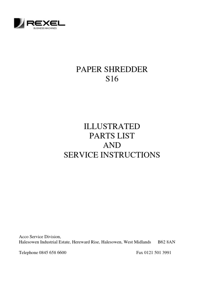 Service And Parts Manual Rexel Shredder S16 Electrical