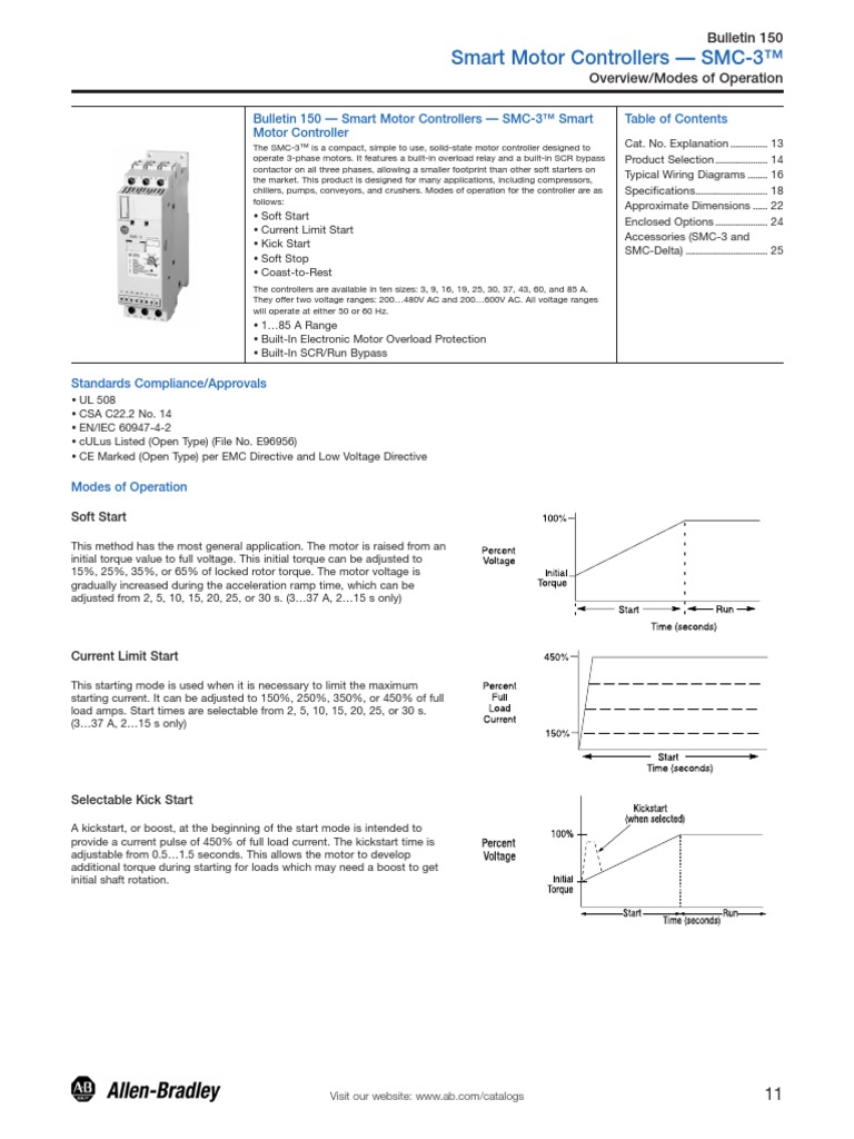 Smc 3 low voltage soft starters. Smc 3 smc flex and smc 50 smart motor controllers bulletin 150 topic page topic page overview overview smc 50 controllers continued smc controllers 2 product selectionsmc 50 solid state controller 64 control mode overview 3 typical wiring diagrams 74 smc 3 controllers 7 specifications 84 catalog number explanation 7 accessories 77. They include overload protection integral bypass and motor and system diagnostics. The smc 3 is a compact simple to use solid state motor controller designed to operate 3 phase motors. Smc 3tm softstarter dreiphasige systeme smc 3tm soft starter installazioni a tre cavi arrancador suave smc 3tm instalaciones 3ø partida suave smc 3tm instalações trifásicas 41053 368 01 dir 41053 368 version 04 printed in usa. 12 communication adapter product code.